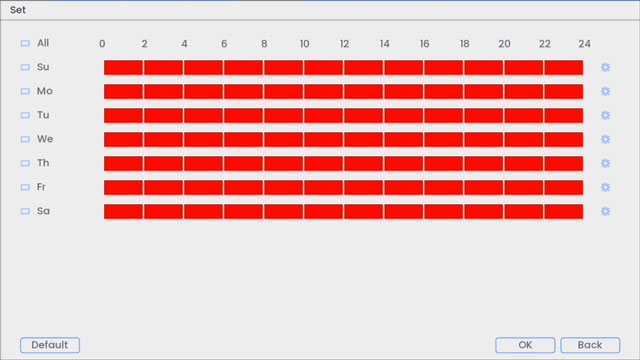 • Schedule: Click Setting choose which days and times or the week to enable automatic warning lights. Click or click-and-drag along each of the red timelines to quickly add or remove time from each day’s schedule in 30minute segments.