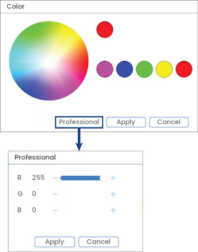 ◦ Smart Security Lighting: Check to enable Smart Security Lighting. Click Setting to select a custom color or choose how long the light will stay on following a face detection event. Click on the red color box to open the custom color settings. To learn more, see 14.1.3 Smart Motion Activated Smart Security Lighting, page 58.