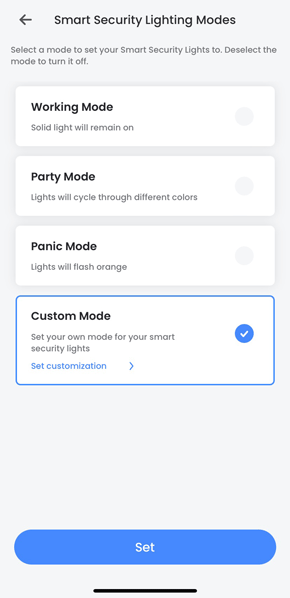 5.Select a mode to set your Smart Security Lighting to. Personalize Smart Security Lighting by selecting your own colors in Custom Mode.