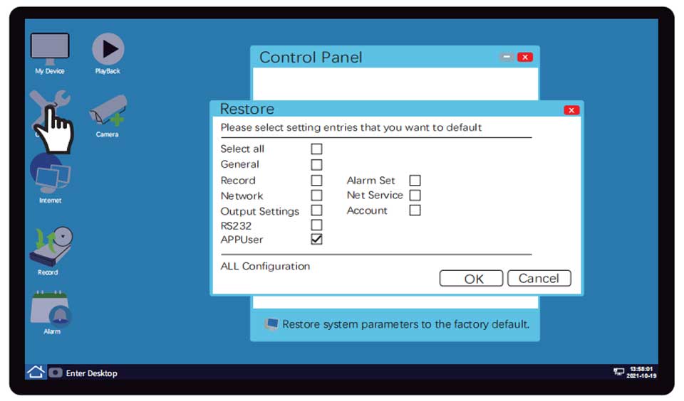 Open the Control Panel→Click Restore Default→Select APP User→Click OK