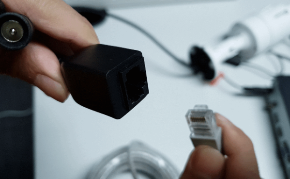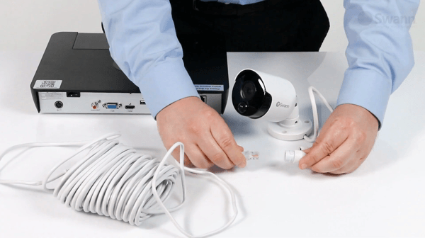 Grab the Ethernet connector from the NHD camera and then grab the camera cable (Ethernet/network camera cable) that came with the kit. Connect these two together. You should hear a clicking noise when you connect them together.