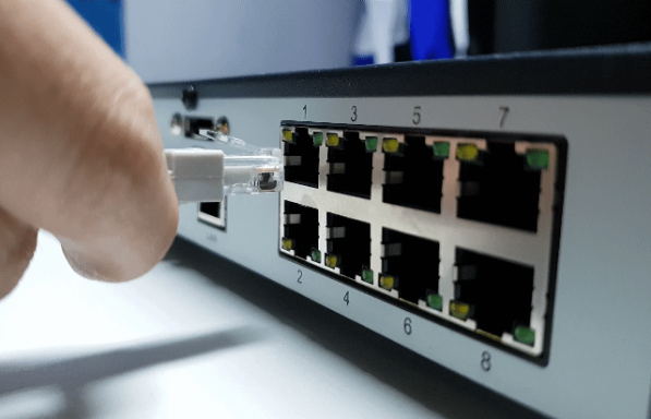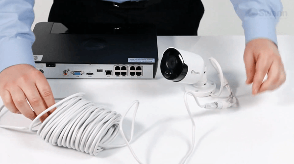 Grab the other end of the Ethernet cable and connect it to the back of your NVR system. Only connect this cable to the Ethernet port that has a number and is in a group with other Ethernet ports. See the sample clip below.