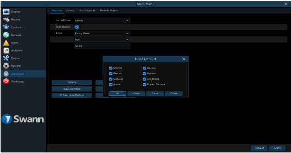 Go to Main Menu > Advanced > Maintain and click the Load Default button. Click All and then Save.