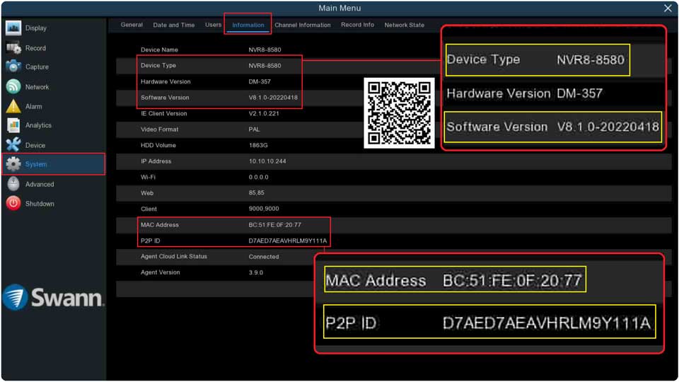 How to get your Swann product model number, P2P or UID, MAC address or ID, Serial Number (S/N), and Software/Firmware (FW) version?