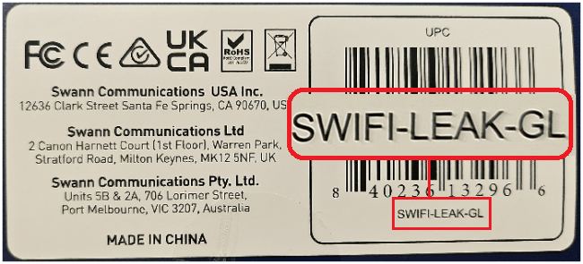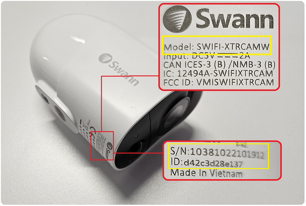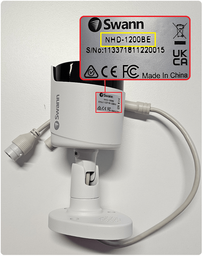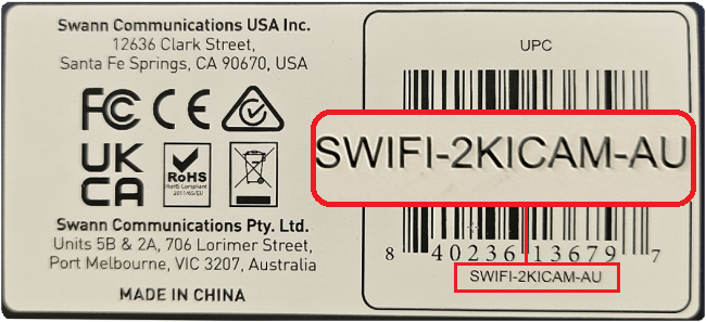 For Battery/Wireless (IP) cameras, the Product Model is indicated on the sticker or printed around the camera body or underneath the unit. The code usually starts with SWIFI, SWWHD, or SWAD.