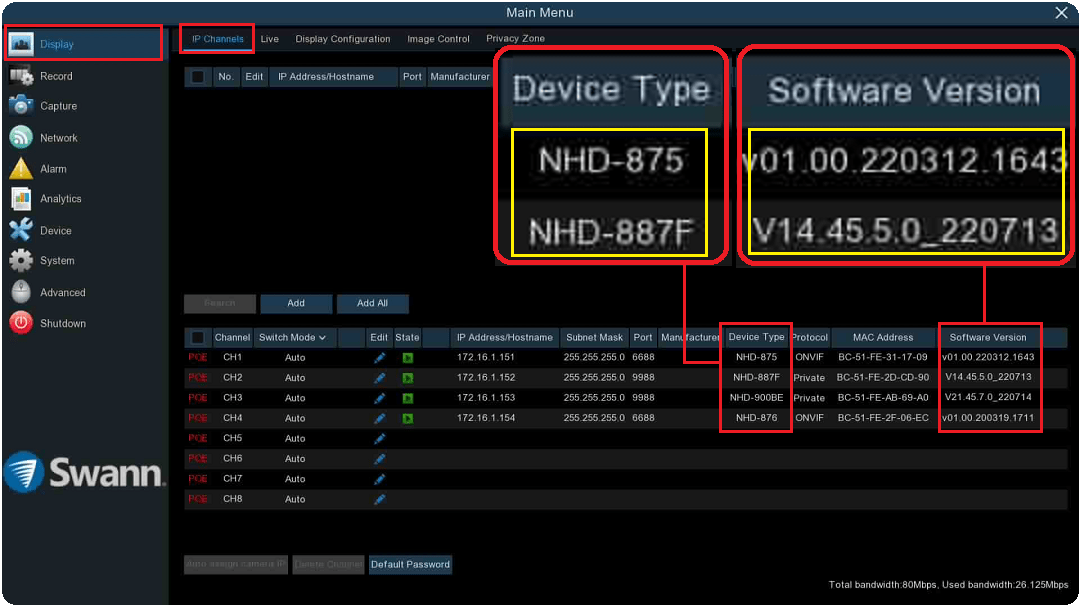 The Product Model and Software/Firmware (FW) version of your NHD series security camera can be found in the IP Channel tab of your recorder’s console menu. Login to your recorder and navigate to Setup > Display > IP Channel tab.