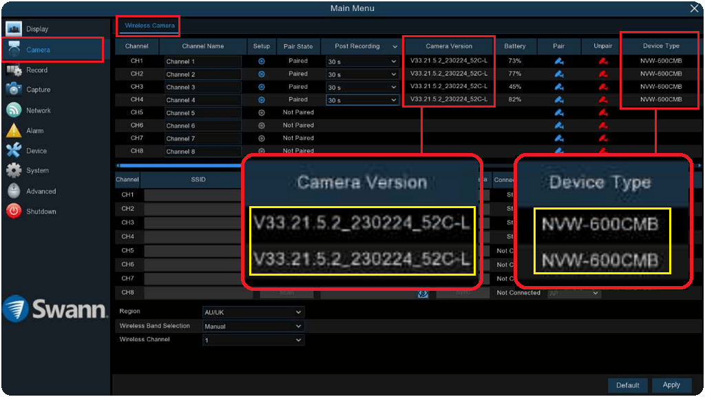 The Product Model and Software/FW version of your NVW series security camera can be found in the IP Channel tab of your recorder’s console menu. Login to your recorder and navigate to Setup > Camera > Wireless Camera tab. *Please note that the Device Type is on the last tab of this window.