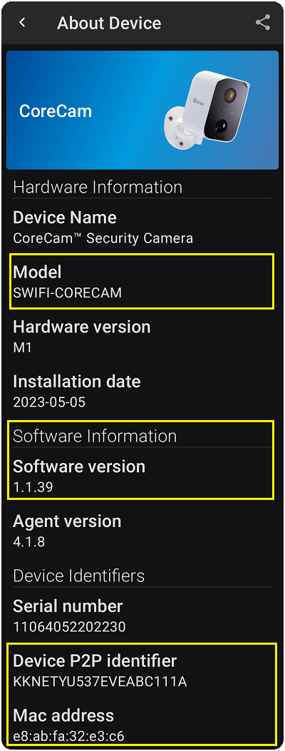 The Product Model, Software/Firmware (FW) version, P2P or UID, and MAC address of your Battery/Wireless (IP) camera can be found on the Swann Security app. On the mobile app, open the Devices tab (bottom right corner) > Name of your Device > About Device.