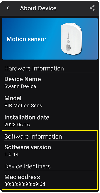 The Software/Firmware (FW) version and MAC address of your sensor can be found on the Swann Security app. On the mobile app, open the Devices tab (bottom right corner) > Name of your Device > About Device.