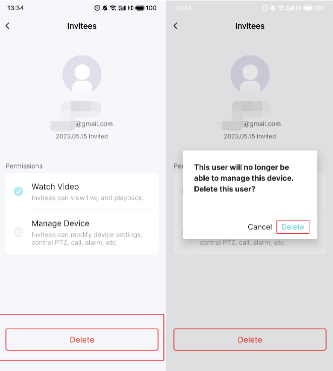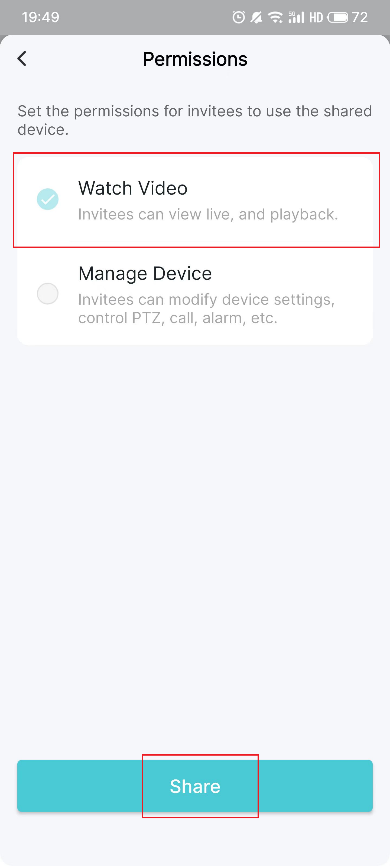 Step 3. Set the Permissions for the invitees. Note that there are two different permissions for your invitees. Watch Video will restrict their privilege to only watch live and playback. If you want to give permission to your invitee for control your VIGI devices, please assign Manage Device.