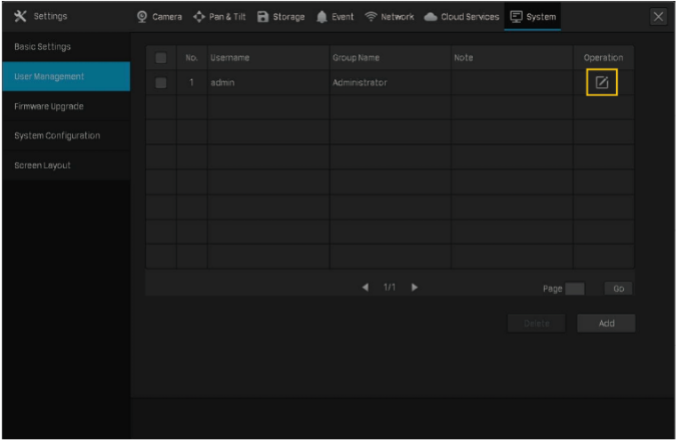 Step 1. Right click on the Live View screen, go to Settings > System > User Management, select the admin account and click