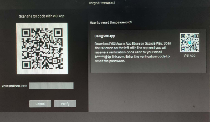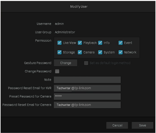 You can change the password and Password Reset Email of the VIGI NVR. Password Reset Email is used to receive the verification code when you need to reset the password.