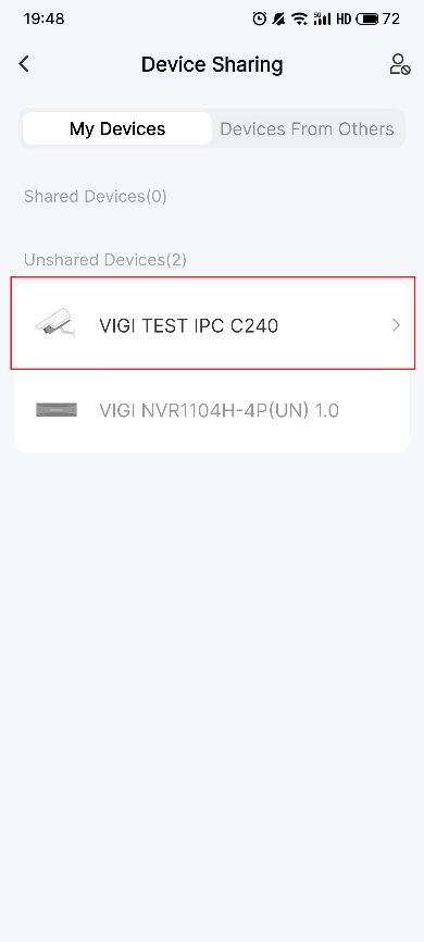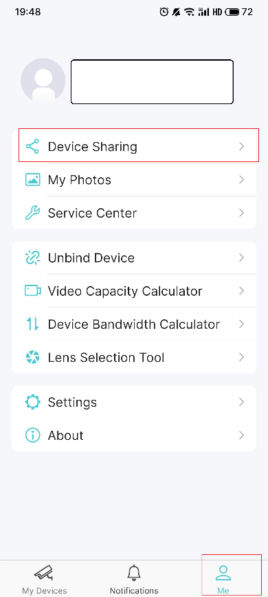 Step 1. On the Me page, tap Device Sharing and select the device you want to share.