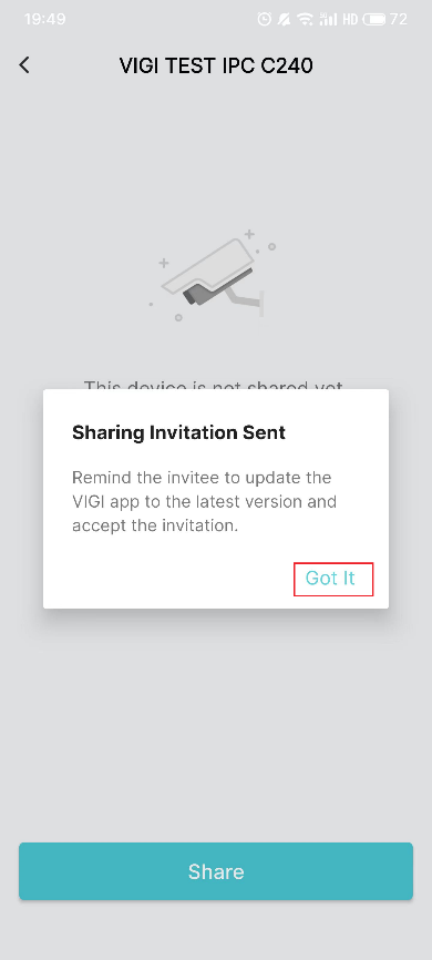 After selecting the permission for your invitee, click Share and Got It. Now the invitee can view the camera now.