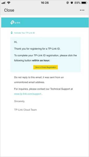 3. Open your mailbox and find the verification email. Click the Click to Finish Registration button in the email to activate the TP-Link account.