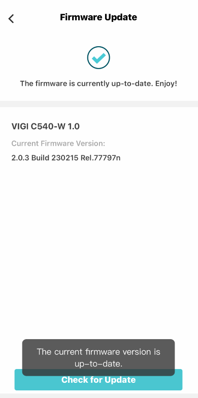 Step 3. On the Firmware Update page, VIGI app will automatically check the update for you. You can also tap on Check for Update to manually check the update of your camera.