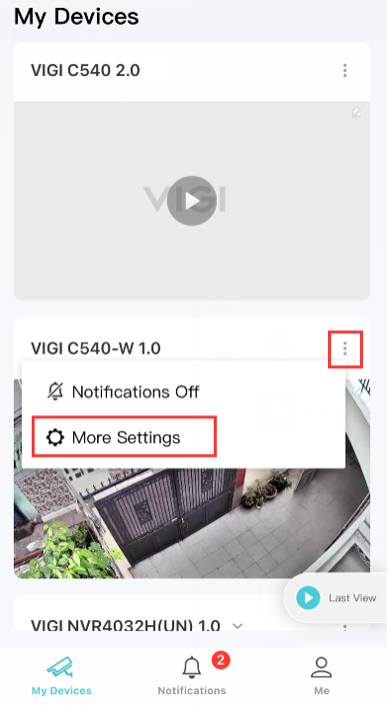 1. On the My Devices page, tap on your three-dot icon on the model. Then tap on More Settings. Here we take VIGI C540W as an example.
