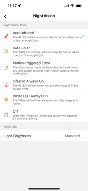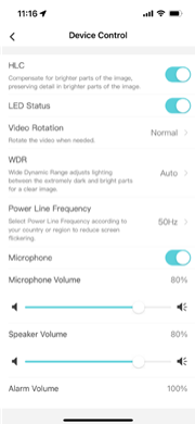 Follow the app instructions to configure the settings. You can enable HLC, set LED status, change the video direction, configure WDR, disable the microphone or adjust the microphone volume (for certain cameras), adjust the speaker/alarm volume (for certain cameras), set the night vision and light brightness (for certain cameras).