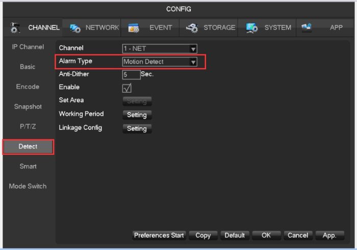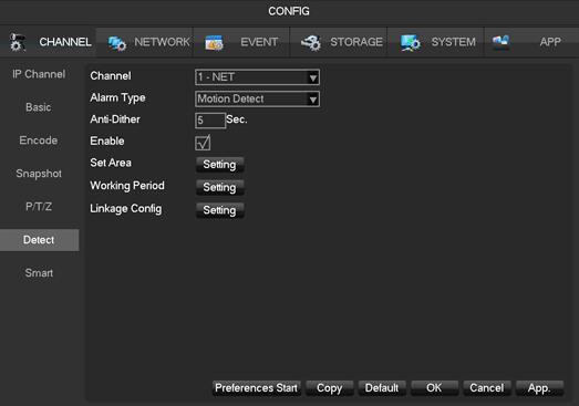 1) Select main menu, enter Channel—Detect—select want to setting channel, like below pic, Enable it , and setting the Set Area-Working Period-Linkage Config.