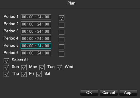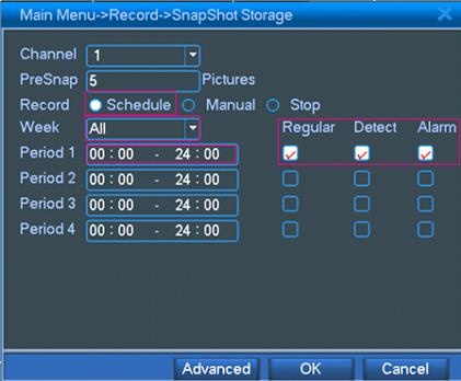 Go to Main Menu->Record->Snapshot Storage, select “Record->Schedule”,”Week->All” and “Period 1->00:00-24:00”,then click “OK” see below picture: