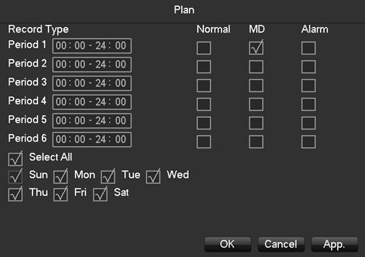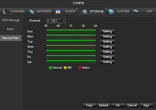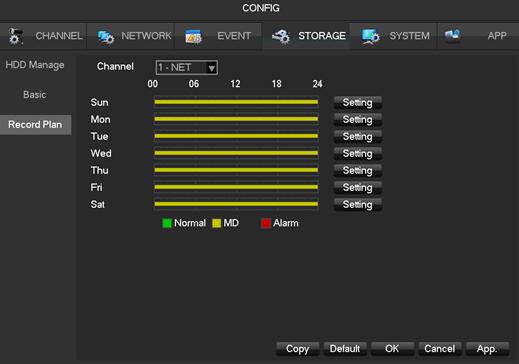 2) select Storage —Record Plan—channel—click setting select, the model select MD ,like the below pic.