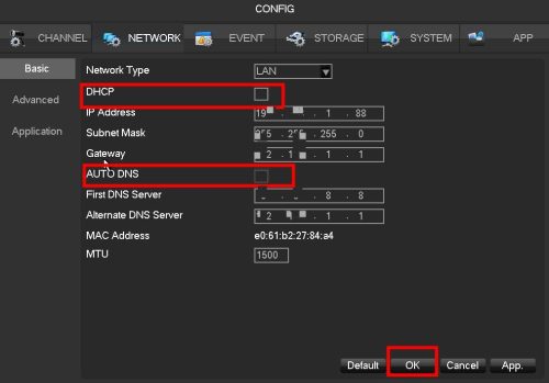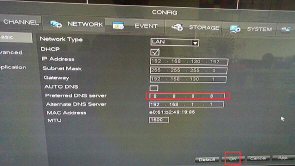 3. Please try to enter system > main menu > CONFIG > Basic, change the DNS server to 8.8.8.8 and click “OK” to save. And reboot the DVR .