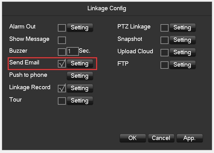 1.1.4 Enter “Linkage Config“,tick “Send Email” as below.