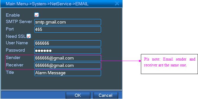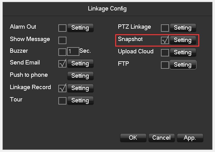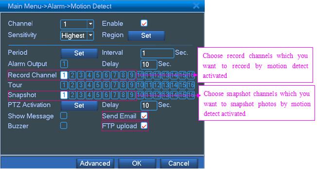 Go to Main Menu->Alarm->Motion Detect,select “Enable”,”Snapshot” and “Send Email”,then click “OK”,see below picture: