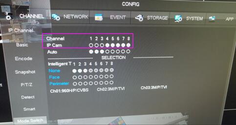 To set each channe’s parameter right click anywhere on the screen to open the drop the down box and select [Main Menu] and then select the appropriate channel.Select [Mode Switch] then select [IP CAM] and you can add IP camera in the [IP Channel] menu.Set the channel to connect to IPC as required, and the DVR will restart after confirmation.