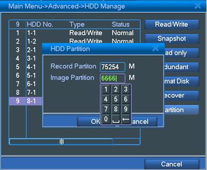 1)Go to Main Menu->Advanced->HDD Manage,click “partition” and write partition value for snapshot,then click “OK”,see below pictures: