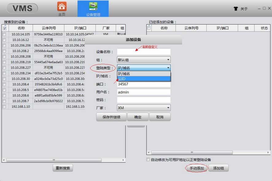 vms software, select manual addition in the device management interface, select cloud ID for login type , fill in the device serial number, save and continue, homepage – monitoring interface, select the added serial number for remote access