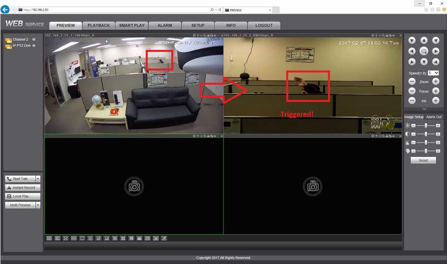 This article will explain setting up a fixed camera on motion detection to trigger a NVR to move a PTZ to a preset.