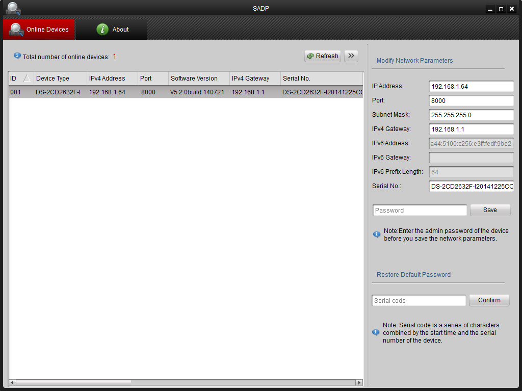 For a Hikvision IP Camera, you’re going to be configuring your camera using the SADP tool (which comes with the camera or you can download it here). Connect your IP camera to your network (router/switch) and ensure that it’s getting powered (PoE switch, power supply, etc).